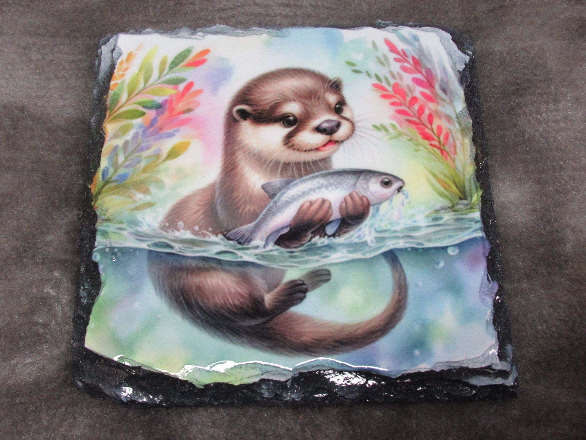 Otter Coaster Printed on a natural square rock slate with a gloss finish, due to being natural stone every single slate is unique and cuts will differ, the edges of the front of the slate are naturally rough in texture. Hand wash only, not suitable for the dishwasher. Individually boxed, with sticky rubber feet included. Size: 9cm x 9cm. approx