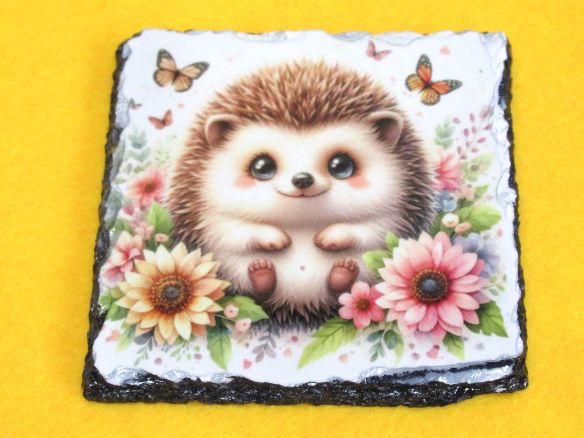 Hedgehog Slate Coaster – Natural Slate Drink Coaster with Woodland Hedgehog Design