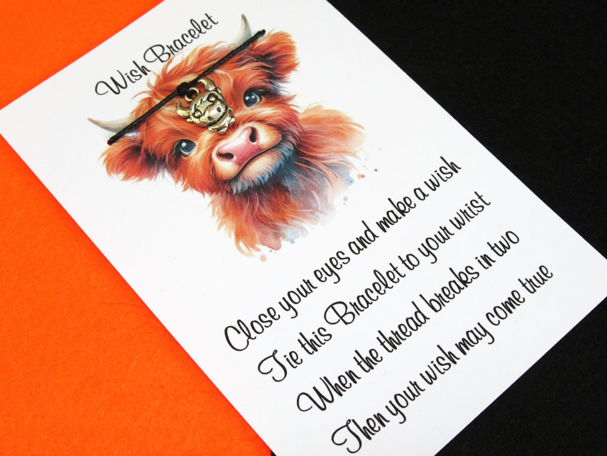 Bring a little highland charm to your day with this Highland Cow Wish Bracelet, handmade using a Tibetan silver cow charm on a 1mm waxed cotton cord. Available in 8 colours (black, blue, grey, lavender, pink, purple, rose, red). Each bracelet is 30cm long and mounted on a themed wish card featuring a printed highland cow design.
