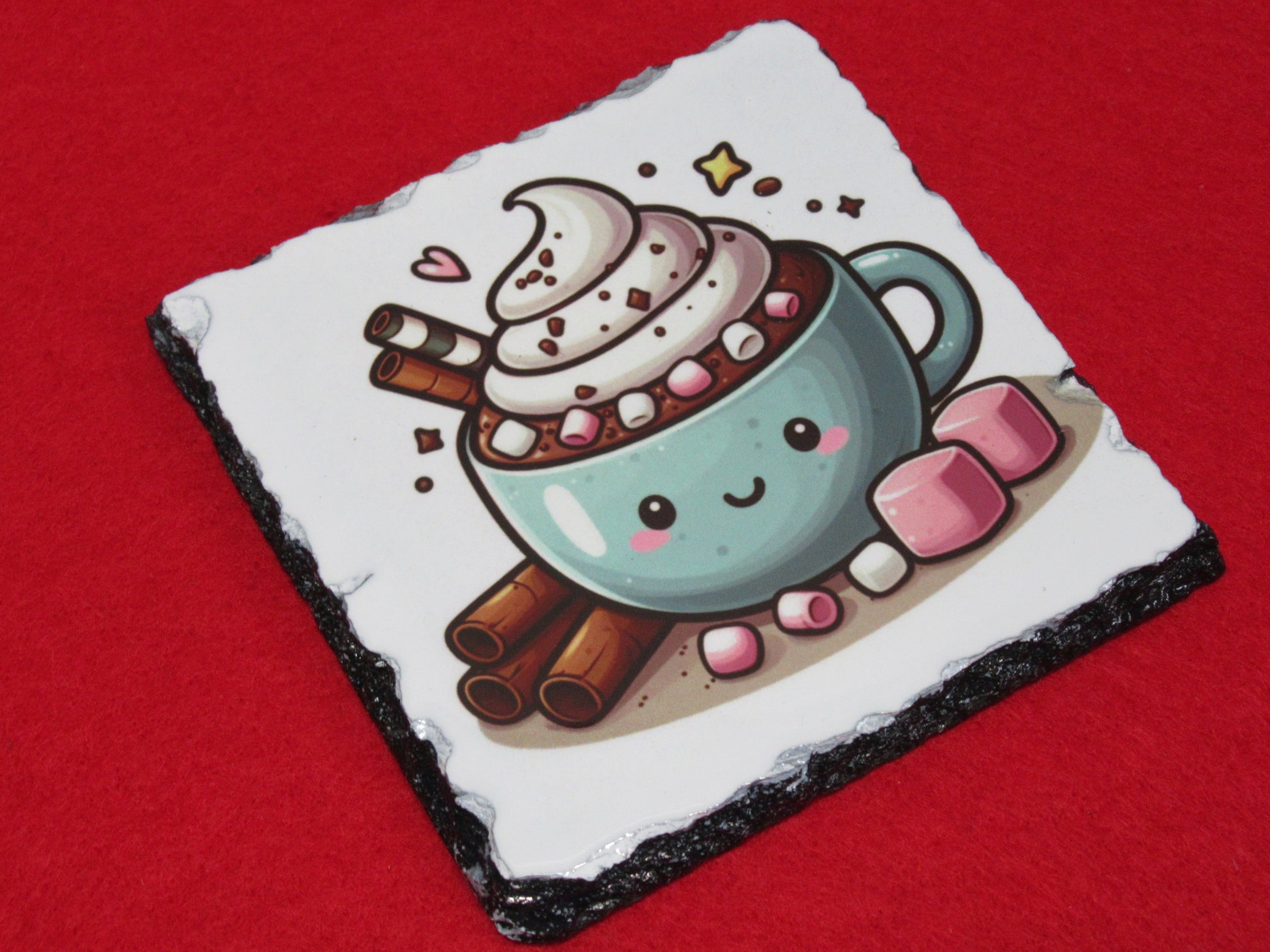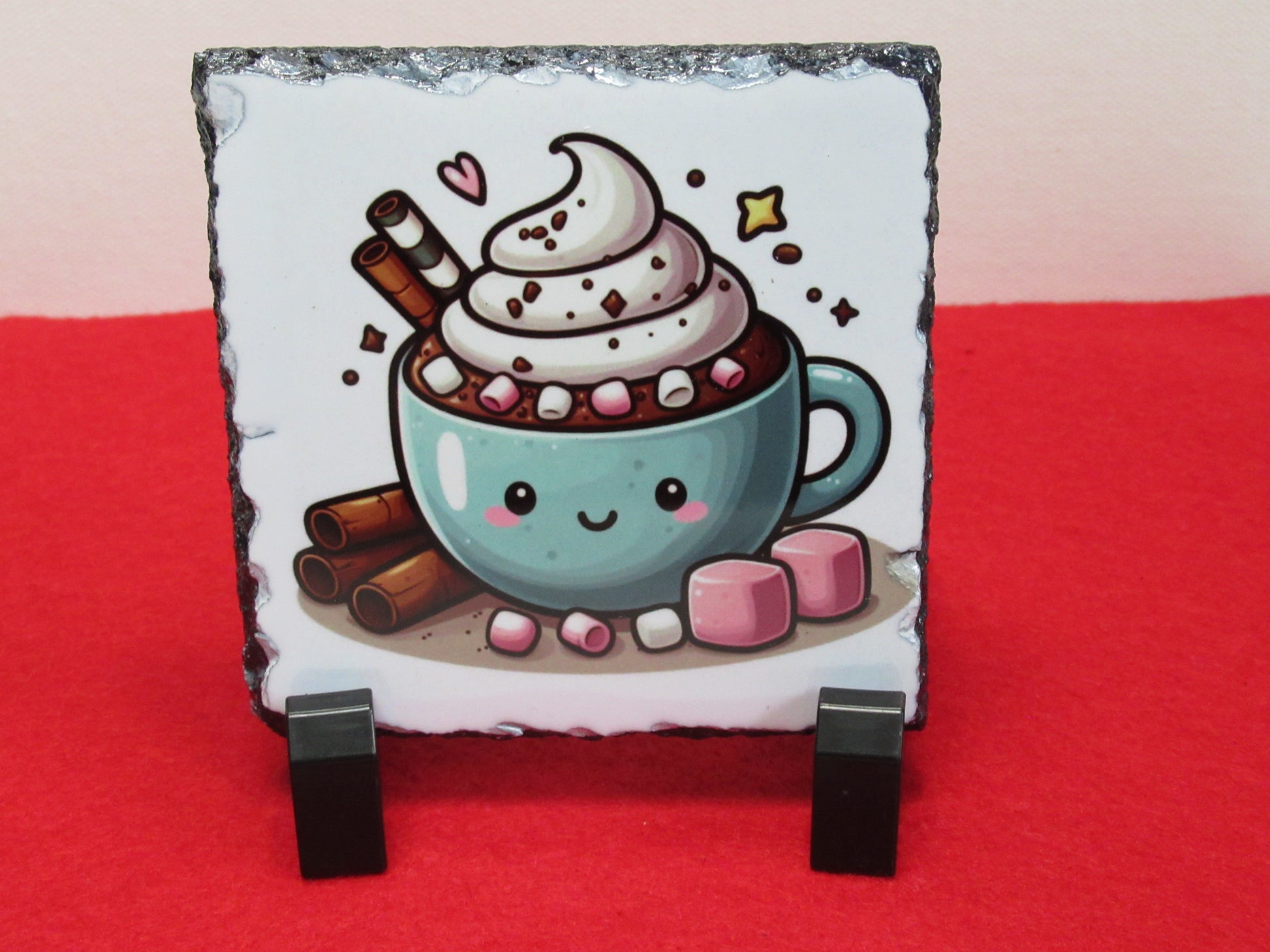 Hot Chocolate Coaster Printed on a natural square rock slate with a gloss finish, due to being natural stone every single slate is unique and cuts will differ, the edges of the front of the slate are naturally rough in texture. Hand wash only, not suitable for the dishwasher. Individually boxed, with sticky rubber feet included. Size: 9cm x 9cm. approx Due to lighting the colour may differ slightly from listing photo