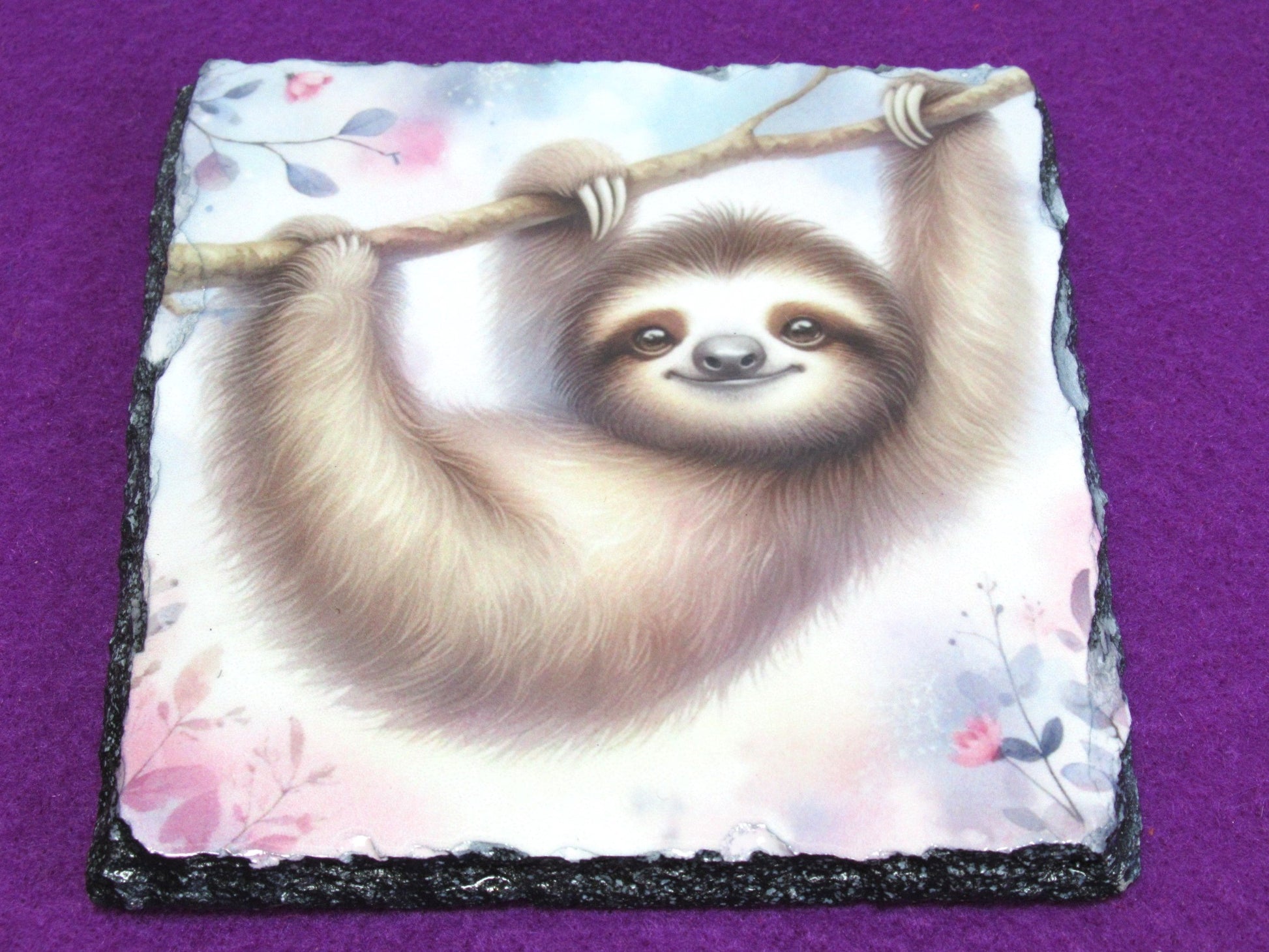 Sloth Slate Coaster – Natural Slate Drink Coaster with Cute Sloth Art