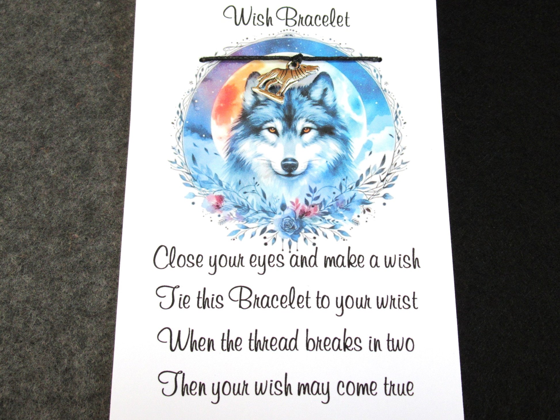 Make a wish and wear it close with this handmade Wolf Wish Bracelet, featuring a detailed Tibetan silver wolf charm on a 1mm waxed cotton cord. Choose from 8 colours: black, blue, grey, lavender, pink, purple, rose, or red. Each bracelet is 30cm long and mounted on a printed wolf-themed wish card, then hand-packaged in a clear sealed bag.